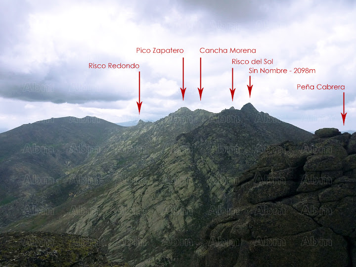Aquí la ruta no tiene ninguna perdida, no tendremos mas que ir subiendo arroyo arriba hasta que lleguemos a un zona mas menos "plana" de prados verdes, si es que no hay nieve. Desde aquí ya adivinamos el collado llamado Portacho del Zapatero, pero nosotros no vamos a llegar hasta el, no es preciso. Desde esta zona de pradera y bajo los pies del Risco Redondo, parte una esquiva senda que siguiendo hitos de piedras nos llevará a la base de este primer pico. A estas alturas y por la vista que tengo de él según subo montaña arriba, no me veo con capacidad de subirlo, es una pared de piedra por la que no hay quien suba, quizá rodeandolo ofrezca otra cara mas fácil. La senda continúa, hasta que nos encontramos con el enorme bloque de granito. Ciertamente es posible subir, puede alcanzarse su cumbre de forma relativamente fácil mediante una trepada de unos 30 metros por un canalón de su cara este y una breve cornisa de la cara sur (II+). Divertido!!