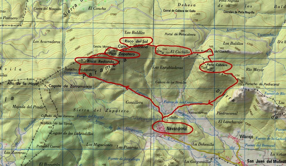 Voy a bajar hacia el Portacho de Piedracanal para descender por el Arroyo de Piedracanal, en dirección a Navandrinal. Esta parte si me va a costar, descender ya con el tiempo que llevo, castiga mis piernas. Que poco me gusta bajar!!! Pero no valen lamentos, es lo que toca llegado este punto. Pasito a pasito voy perdiendo altura, a ratos atravesando retamas o sorteando pequeños bloques de granito. Saltando muretes de piedra, cruzo prados de hierba ya en la zona mas baja. Los prados, los arroyos y las acequias llevan mucha agua y en alguno meto los pies hasta dentro. Pero ya estoy casi en el pueblo y no reparo en mojar los pies, el caso es llegar cuanto antes por que estoy cansado ya de patear. Aun me queda, cuando me encuentro con el arroyo que desciende por la Garganta del Zapatero, ascender unos pocos de metros para alcanzar el camino en el que se iniciaba la ruta al comienzo de la mañana. Una vez superados esos metros, la pista nos conduce rapidamente al pueblo y cuesta abajo llegamos al aparcamiento en donde dejamos el coche. Total en el recuento de la jornada, cinco cumbres "modestas", 2054, 2158, 2113, 2098, 1997; siete horas y media de marcha, cuatro litros de agua, unas cuantas barritas, dos bocatas de lomo muy rico, las sensaciones y las preciosas vistas de las que he disfrutado. Altamente recomendable!! Y con la sensación de que seguro que lo repetiré, tal vez en una invernal.