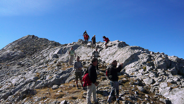 Después de la crónica de Carlos poco queda por añadir, solamente puedo escribir unas breves lineas, intentando transmitir las sensaciones al hacer esta cumbre. Para mi y hasta la fecha, una de las mas bonitas que he hecho. Sea por su situación geográfica aislada, por las inmejorables vistas durante todo el recorrido o por lo "divertido" de su ascenso por la arista este. Arista que se inicia a pocos metros de la carretera y que sin tregua nos lleva a la cumbre sobre su roca caliza, recorriendo zonas bastante aéreas en algunos de los tramos y con patios a izquierda y derecha que son difíciles de olvidar. Emocionante sin duda, como ir sobre la cuerda floja, con los sentidos centrados únicamente en ascender sin cometer ningún error y tratando de no ser vencido por la sensación de vértigo. Sensaciones parecidas al ascenso de Torreceredo, pero con vistas muchísimo mejores. Desde la cumbre y en un día claro como el que nosotros tuvimos, podremos observar los tres macizos de Picos de Europa, el Curavacas, el pico Tres Provincias, Peña Prieta y sin problema todo lo que nos rodea en treinta kilómetros a la redonda. Gracias a los compañeros de ruta por compartir conmigo esta estupenda cumbre.