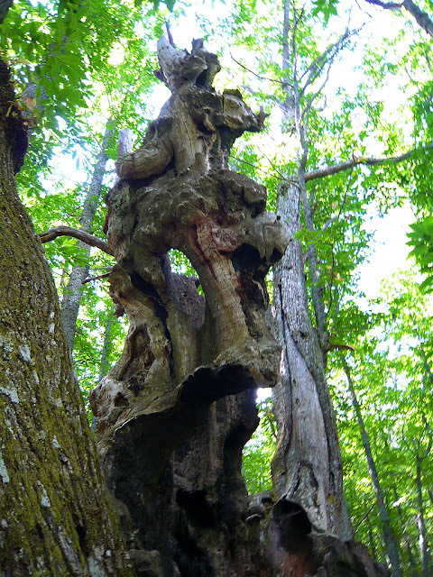 En este lugar el camino gira ciento ochenta grados y se dirige hacia el inicio de la ruta pero manteniéndose a mayor altura que en la primera parte, atravesando el bosque por la mitad. Solamente habrá que estar atentos en una zona en la que la senda se bifurca. En este punto observaremos como las balizas marcan el camino correcto que es el de la derecha que sube ligeramente, haciendo una "S". Por ultimo el camino toma una buena pendiente hacia abajo para volver a juntarse con la primera parte de la ruta. Hay que tener un poco de cuidado de no resbalar, en tiempo seco por lo polvoriento del camino y en invierno por que estará un poco embarrado. Como dije al principio en poco mas de una hora habremos completado el camino circular, algo mas si hemos parado a la mitad para comer algo o para que los enanos retocen. Seguro que habremos disparado alguna foto para enmarcar en un lugar mágico como este y que nos llevaremos de recuerdo, además de alguna que otra castaña en otoño. Es importante recordar otra vez, que la época de mayor esplendor del castañar es precisamente el otoño, cuando mucha gente se acerca a coger castañas o disfrutar de los colores con los que se tiñe el bosque. Se suele saturar de visitas y el ayuntamiento regula el acceso como pasa en el hayedo de Montejo o en la Tejera Negra, así que es conveniente llegar pronto si queremos aparcar el coche sin problemas.