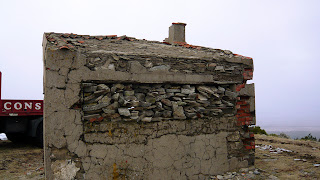 Desde el vértice veremos a unos pocos metros de distancia por el otro lado del vallado, una especie de monumento o memorial, al Conde del Arco, familia que supongo que será dueña de este monte!! Arrrrgggg, que rabia me da. Soy de los que piensan que debería ser posible que se transitara con libertad por cualquier territorio dentro del país. Una ves llegado al vértice, queda a nuestro criterio si seguir adelante hacia el Puerto de Pasapán o regresar en este punto. Yo decido continuar pues realmente la intención que tengo es recorrer toda esta parte de la sierra por lo menos hasta el Puerto de Pasapán y encontrar el refugio que aparece en el mapa, ver el estado en el que está y ver si fuera posible pasar la noche en ese lugar si decido hacer el cordal entero incluyendo el de la Mujer Muerta. Así que continuo cuerda adelante disfrutando de las vista de la meseta castellana y de la ciudad de Segovia en la que se adivinan algunos de sus monumentos. Pasaremos por algunos picos mas, incluido el que en los mapas es llamado Majada Pielera con sus 2004 metros, a los pies del cual esta el susodicho refugio. Compruebo que lo que aparece señalado en el mapa como refugio, es nada mas que una caseta medio en ruinas que por el momento conserva el techo pero que está prácticamente apunto de caer, vamos que no se si aguantará ya muchos mas inviernos. Carece de ventanas, o mas bien ventanas tiene, pero como los cristales hace tiempo que desaparecieron, estas están rellenadas de piedras para que no entré el aire.